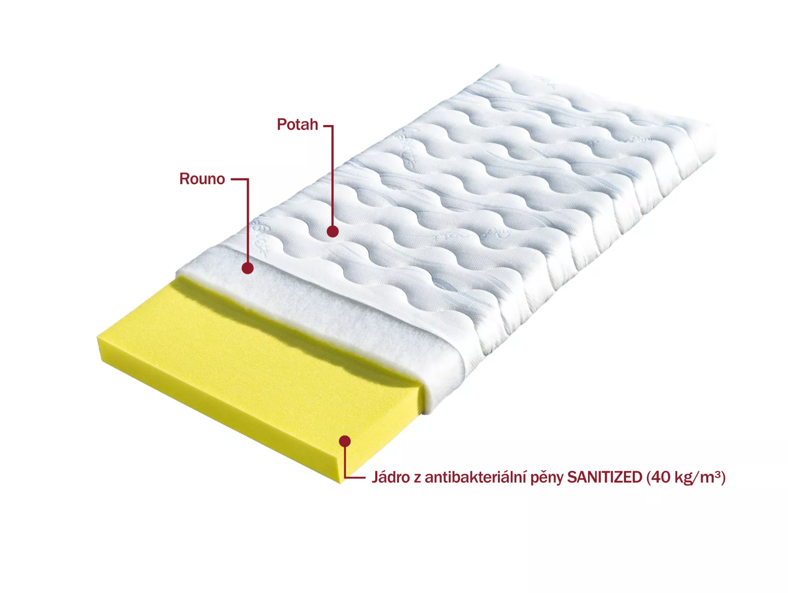 Dětská matrace pro optimální oporu dětské páteře je vyrobena z kvalitní pěny značky Sanitized, která poskytuje trvalou a účinnou ochranu proti bakteriím, roztočům a plísním.