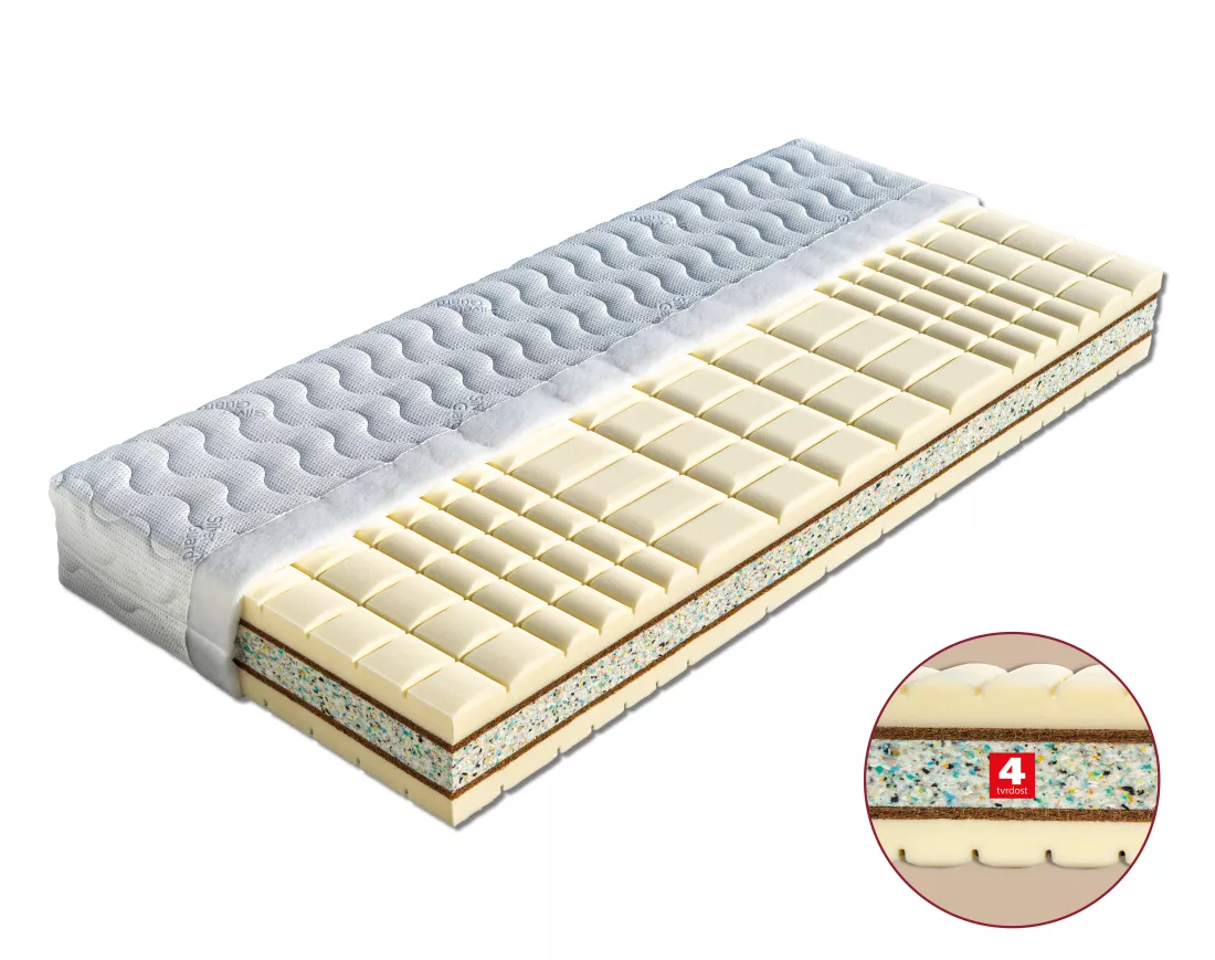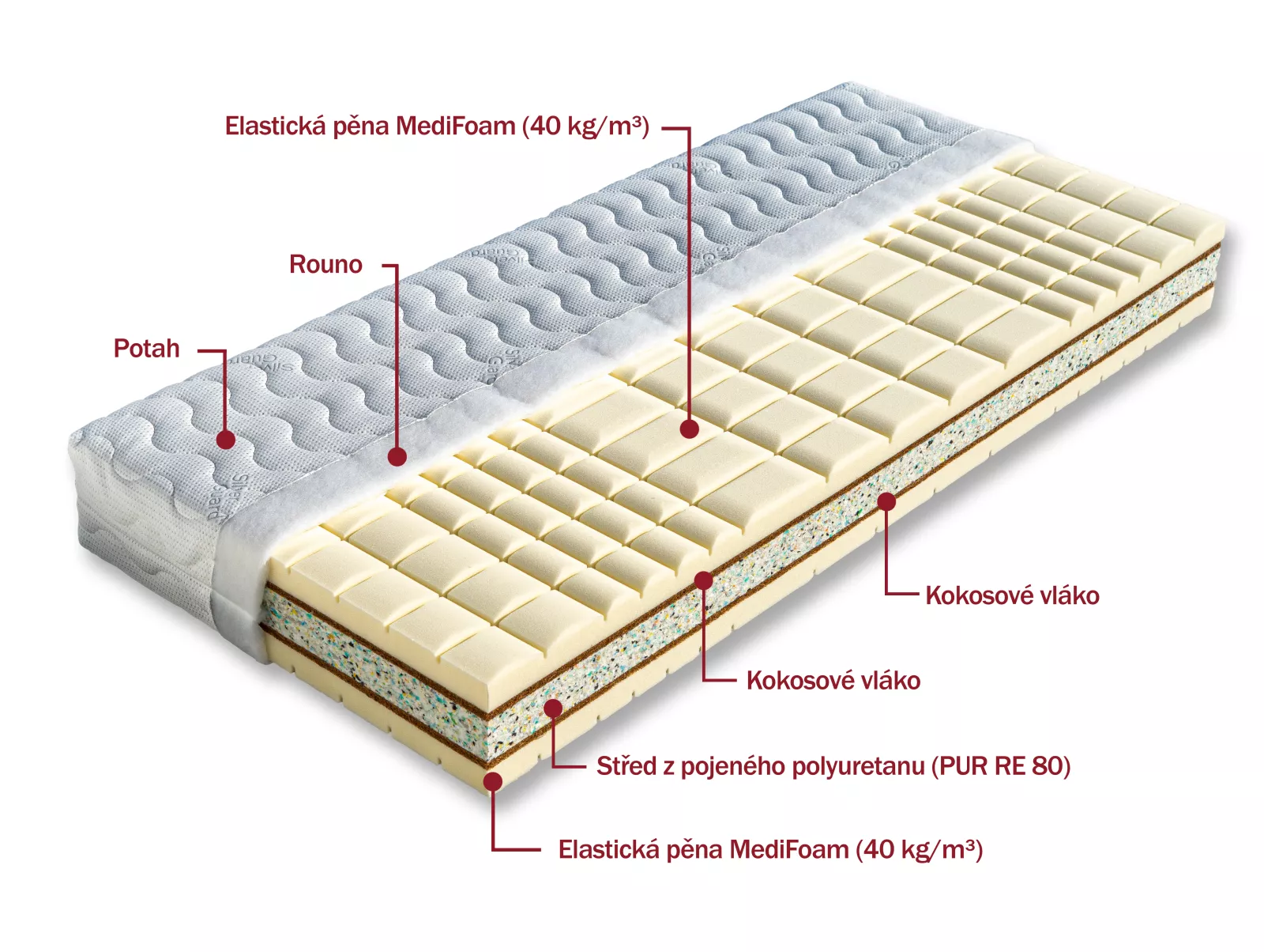 Nosné vrstvy ze dvou elastických vysoce kvalitních pěn MediFoam jsou podloženy vrstvou kokosového vlákna, které napomáhá zpevnění a provzdušnění matrace.