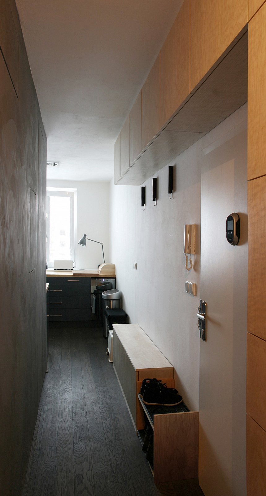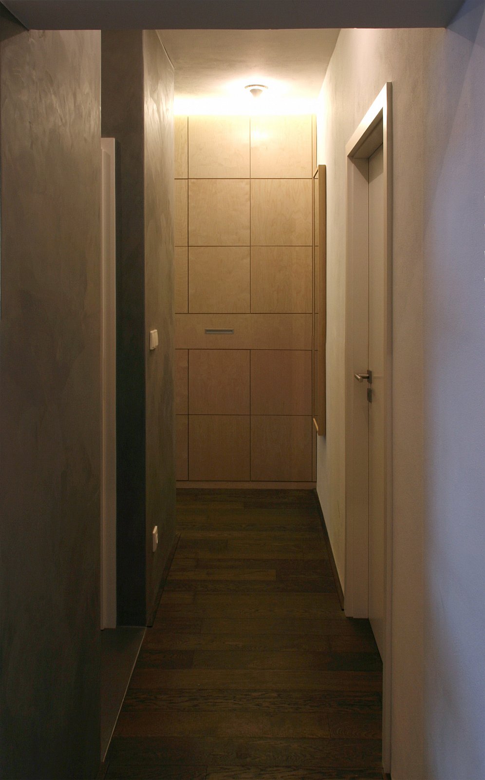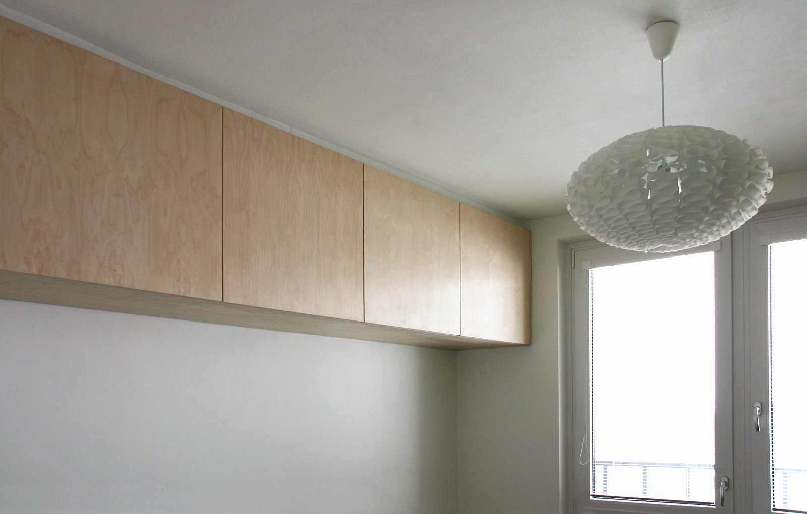 - obývák i vstupní prostory z dýhované dřevotřísky natřené přírodním bezbarvým lakem