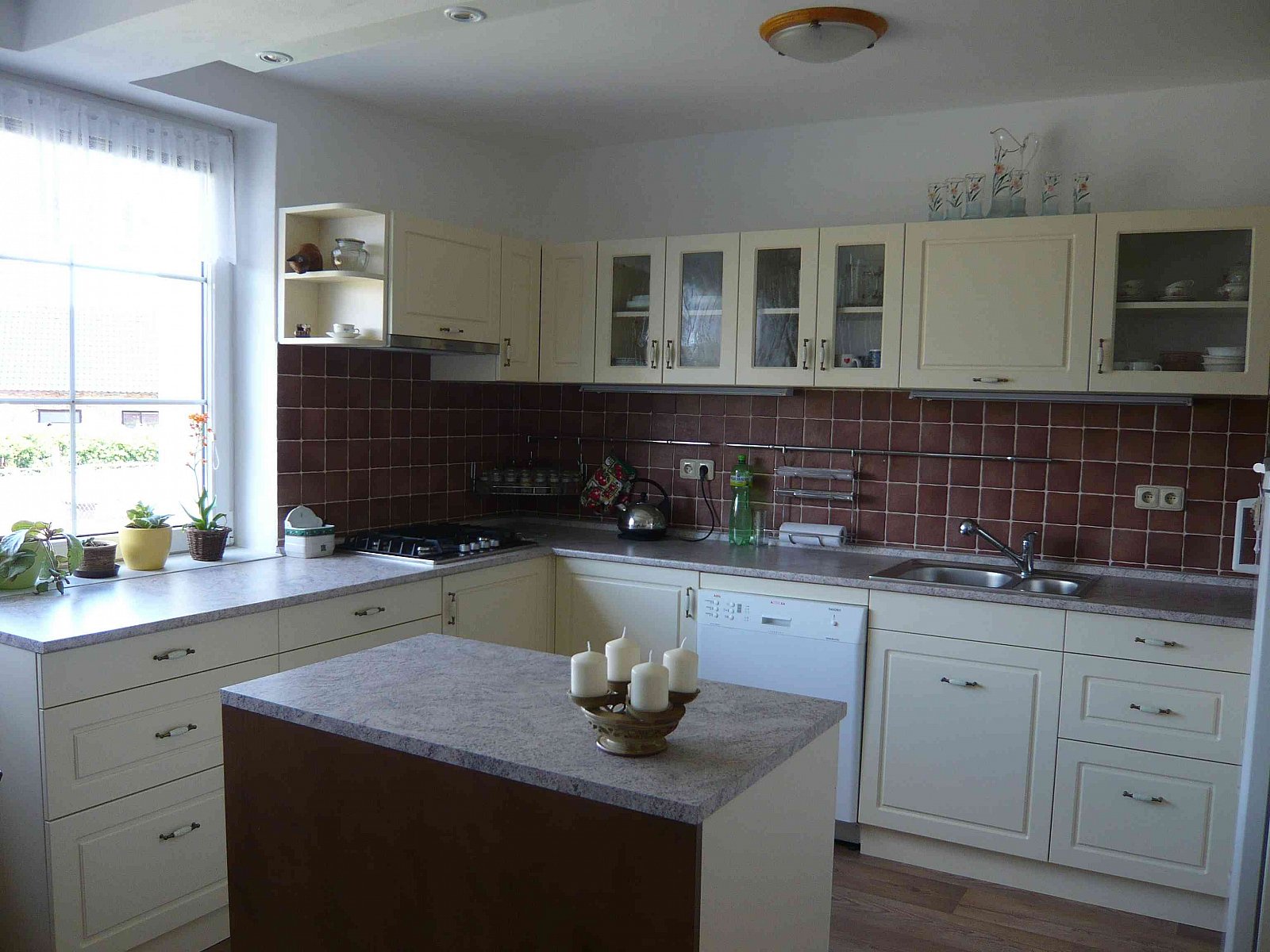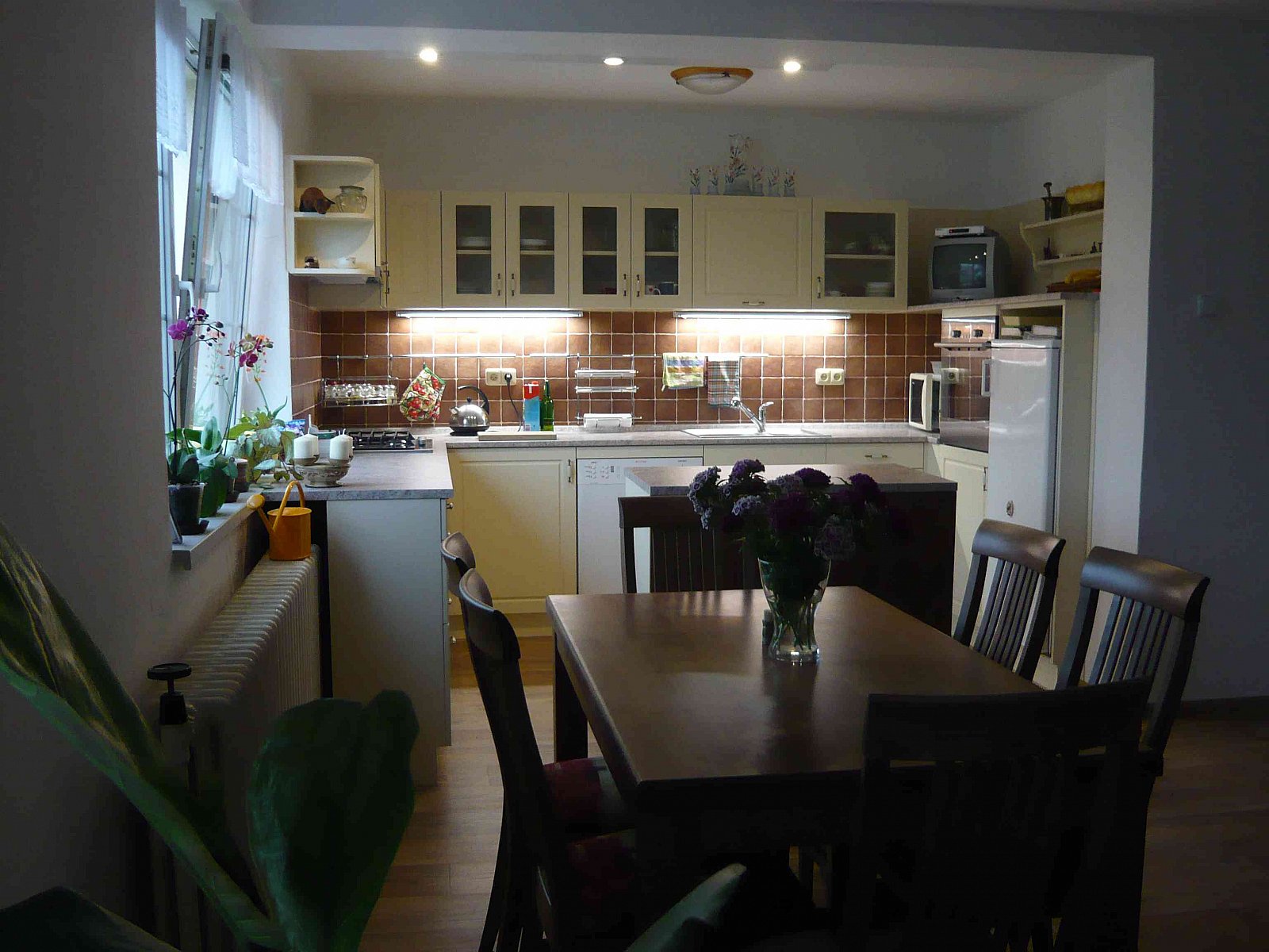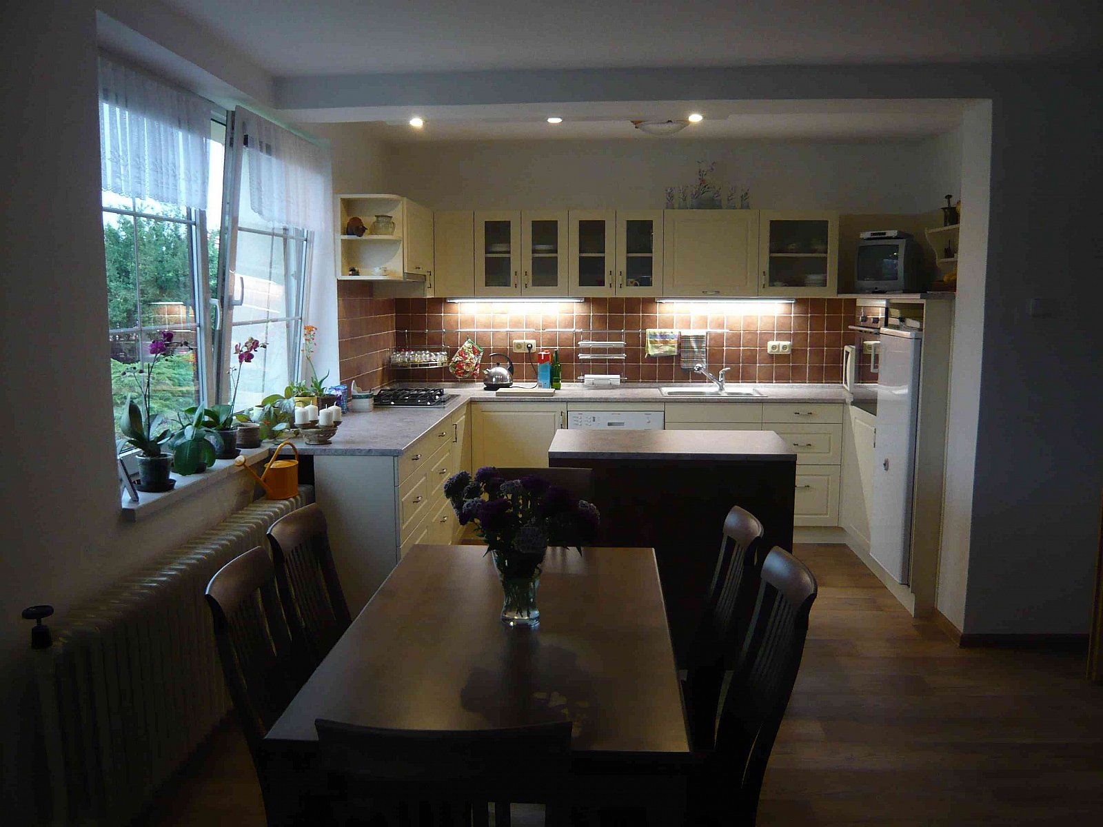 - kuchyně na míru stříkaná MDF v odstínu vanilka v kombinaci s medovým odstínem na stolu, židlích a příborníku