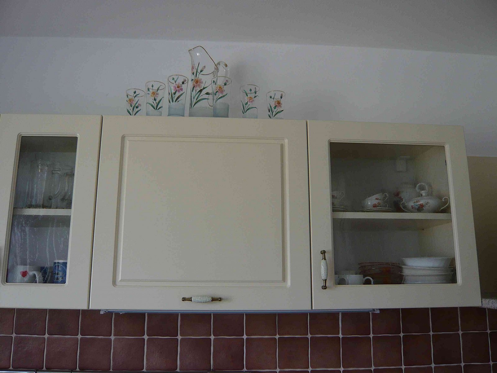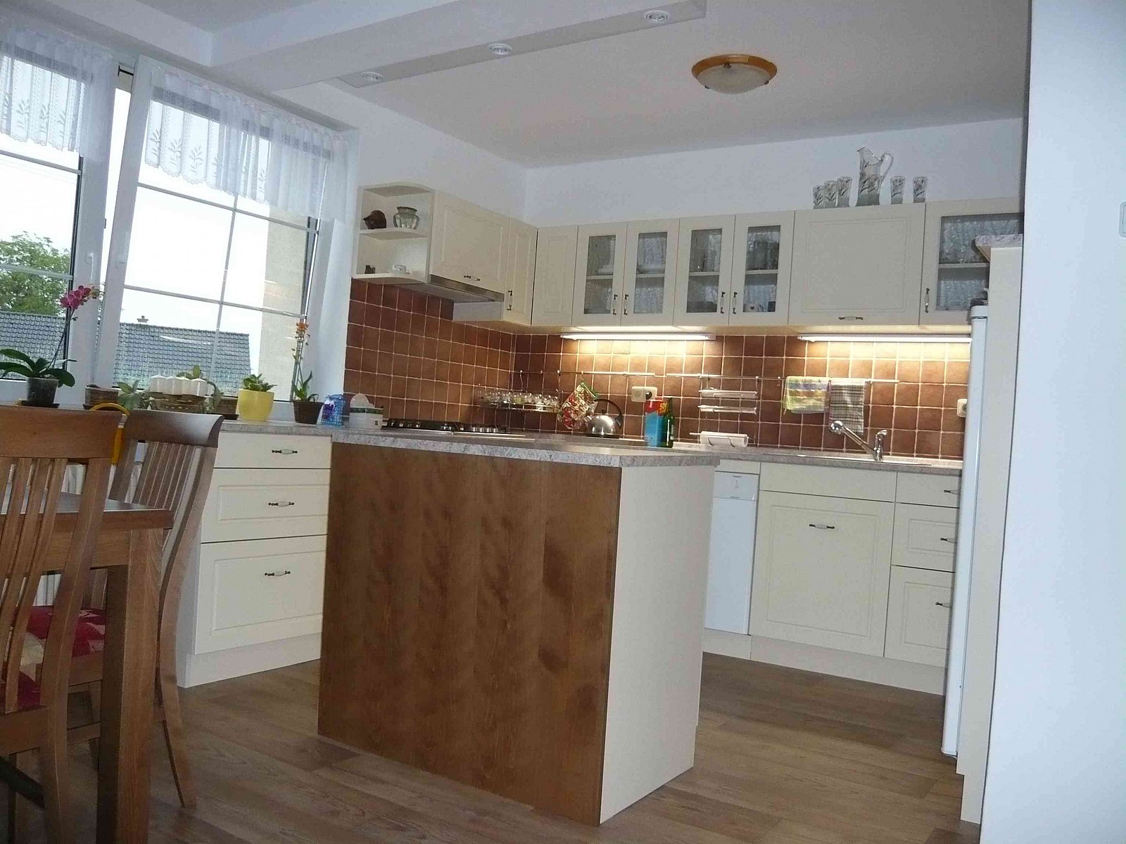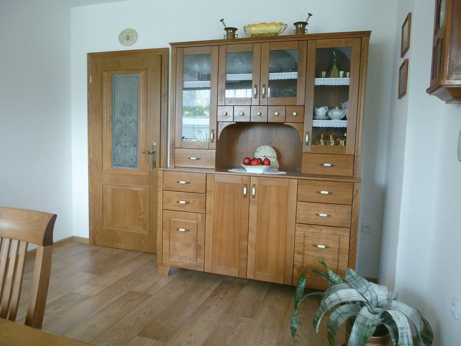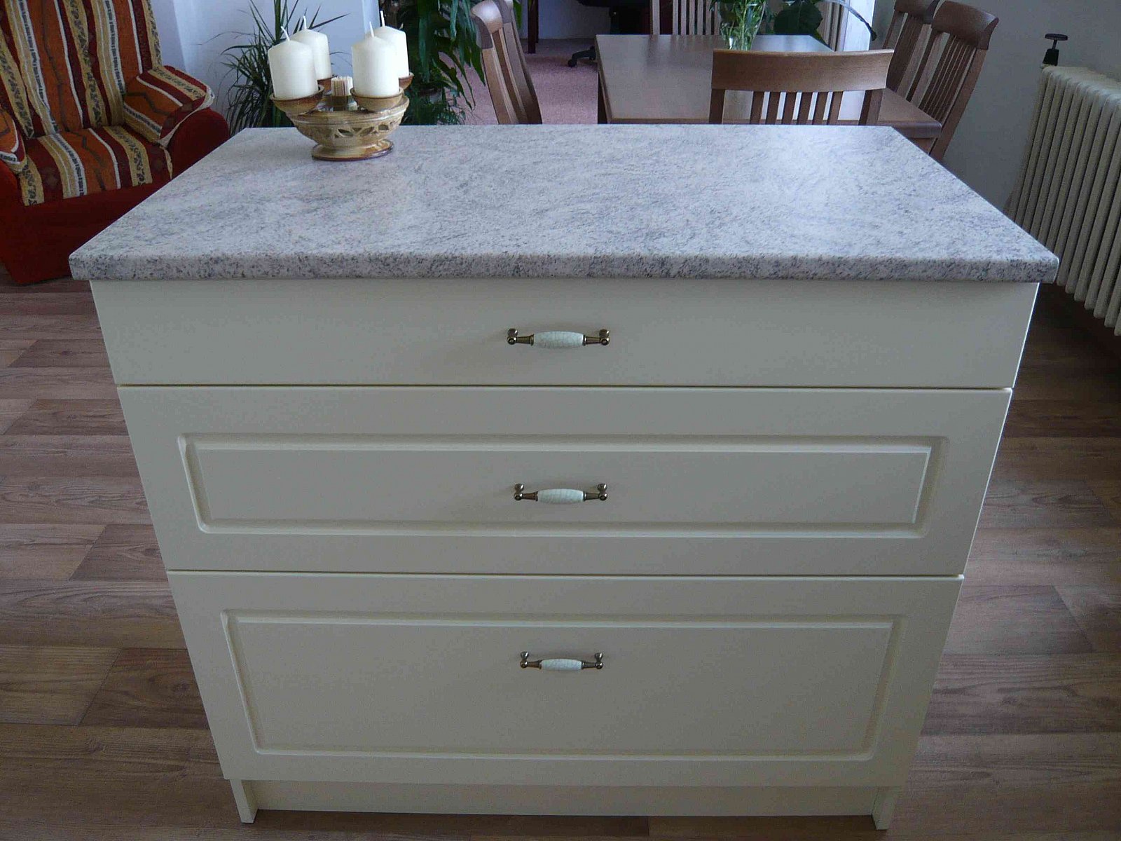 - kuchyně na míru stříkaná MDF v odstínu vanilka v kombinaci s medovým odstínem na stolu, židlích a příborníku