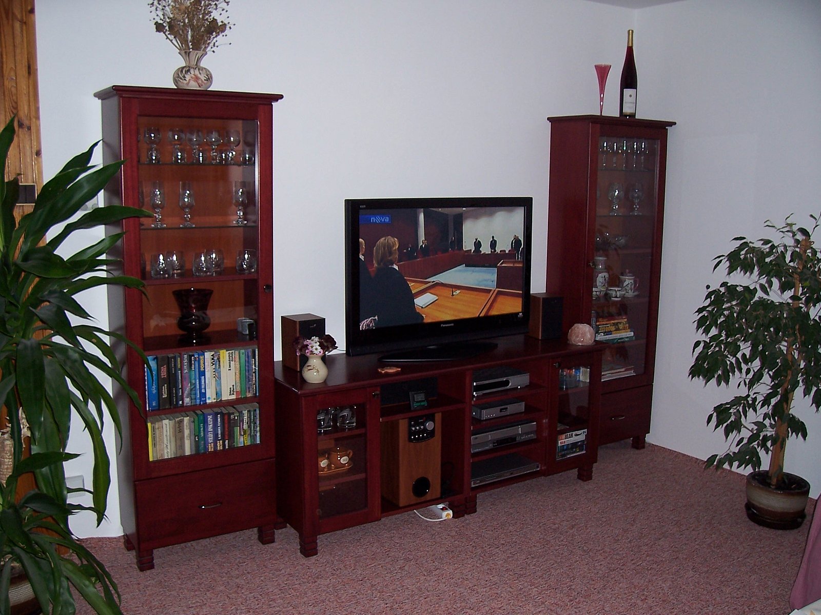 - moderní obývací stěna z dýhy v odstínu třešeň